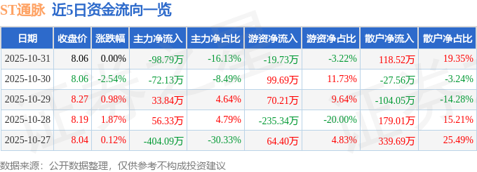 证券之星消息,截至2025年10月31日收盘,ST通脉(603559)报收于8.06元,上涨0.0%,换手率0.19%,成交量7638.0手,成交额612.37万元。