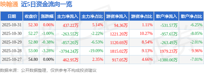 10月31日的资金流向数据方面,主力资金净流入437.22万元,占总成交额5.14%,游资资金净流入94.36万元,占总成交额1.11%,散户资金净流出531.57万元,占总成交额6.25%。