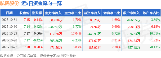 证券之星消息,截至2025年10月31日收盘,航民股份(600987)报收于7.15元,上涨0.14%,换手率0.68%,成交量6.89万手,成交额4931.62万元。