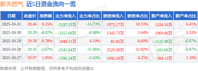 证券之星消息,截至2025年10月31日收盘,新天然气(603393)报收于28.46元,上涨0.25%,换手率1.58%,成交量6.7万手,成交额1.91亿元。