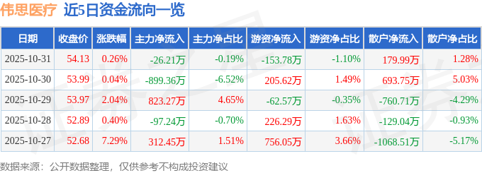 证券之星消息,截至2025年10月31日收盘,伟思医疗(688580)报收于54.13元,上涨0.26%,换手率2.7%,成交量2.58万手,成交额1.4亿元。