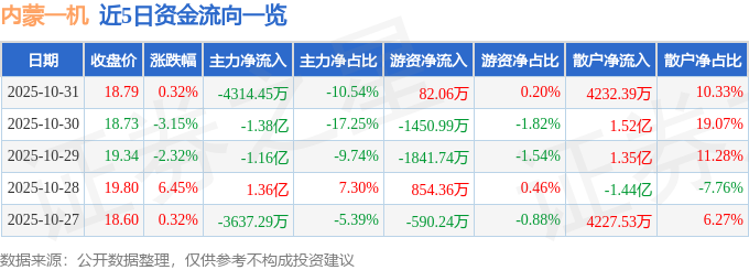 证券之星消息,截至2025年10月31日收盘,内蒙一机(600967)报收于18.79元,上涨0.32%,换手率1.28%,成交量21.85万手,成交额4.1亿元。