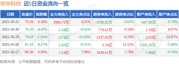 证券之星消息,截至2025年10月31日收盘,华丰科技(688629)报收于76.39元,上涨0.38%,换手率6.61%,成交量12.02万手,成交额9.26亿元。