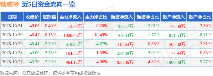 10月31日的资金流向数据方面,主力资金净流入12.78万元,占总成交额0.2%,游资资金净流出188.17万元,占总成交额3.01%,散户资金净流入175.39万元,占总成交额2.8%。