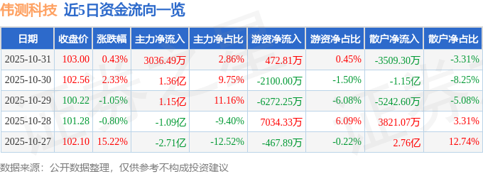 证券之星消息,截至2025年10月31日收盘,伟测科技(688372)报收于103.0元,上涨0.43%,换手率6.95%,成交量10.35万手,成交额10.61亿元。