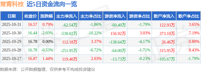 证券之星消息,截至2025年10月31日收盘,常青科技(603125)报收于16.57元,上涨0.79%,换手率2.01%,成交量2.03万手,成交额3368.37万元。