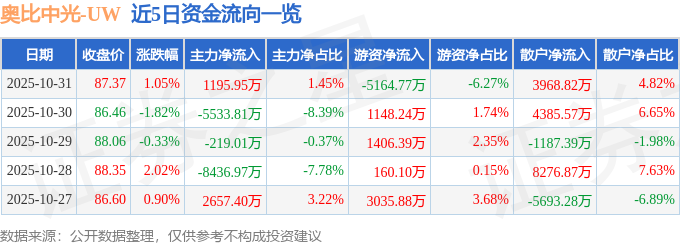 10月31日的资金流向数据方面,主力资金净流入1195.95万元,占总成交额1.45%,游资资金净流出5164.77万元,占总成交额6.27%,散户资金净流入3968.82万元,占总成交额4.82%。
