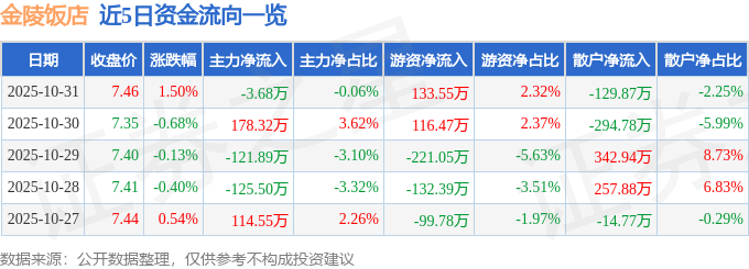 证券之星消息,截至2025年10月31日收盘,金陵饭店(601007)报收于7.46元,上涨1.5%,换手率1.98%,成交量7.74万手,成交额5759.92万元。