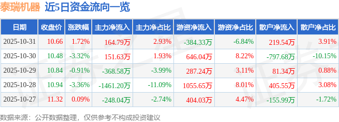 证券之星消息,截至2025年10月31日收盘,泰瑞机器(603289)报收于10.66元,上涨1.72%,换手率1.81%,成交量5.3万手,成交额5620.18万元。