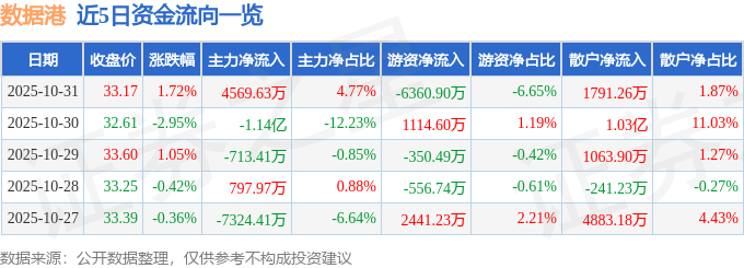 证券之星消息,截至2025年10月31日收盘,数据港(603881)报收于33.17元,上涨1.72%,换手率4.02%,成交量28.85万手,成交额9.57亿元。