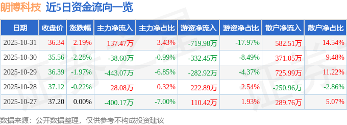 10月31日的资金流向数据方面,主力资金净流入137.47万元,占总成交额3.43%,游资资金净流出719.98万元,占总成交额17.97%,散户资金净流入582.51万元,占总成交额14.54%。