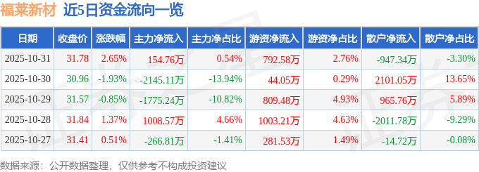 证券之星消息,截至2025年10月31日收盘,福莱新材(605488)报收于31.78元,上涨2.65%,换手率3.27%,成交量9.02万手,成交额2.87亿元。