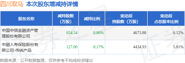 证券之星消息,10月31日四川双马发布公告《四川双马:关于持股5%以上股东减持计划期限届满的公告》,其股东中融人寿保险股份有限公司-传统产品、中国中信金融资产管理股份有限公司于2025年8月16日至2025年10月30日间合计减持781.54万股,占公司目前总股本的1.0238%,变动期间该股股价上涨1.32%,截止10月30日收盘报20.02元。