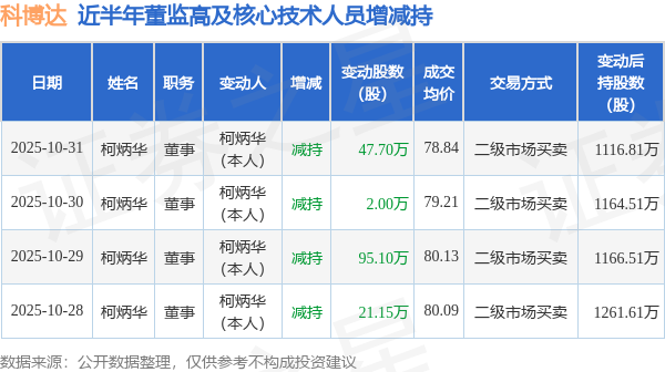 证券之星消息,根据10月31日市场公开信息、上市公司公告及交易所披露数据整理,科博达(603786)最新董监高及相关人员股份变动情况:2025年10月31日公司董事柯炳华共减持公司股份47.7万股,占公司总股本为0.1181%。变动期间公司股价上涨1.11%,10月31日当日收盘报77.5元。