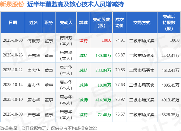 新泉股份近半年内的董监高及核心技术人员增减持详情如下: