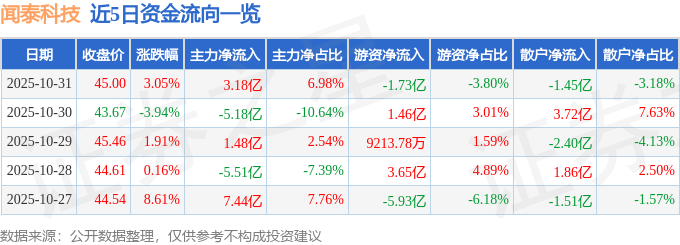 10月31日的资金流向数据方面,主力资金净流入3.18亿元,占总成交额6.98%,游资资金净流出1.73亿元,占总成交额3.8%,散户资金净流出1.45亿元,占总成交额3.18%。