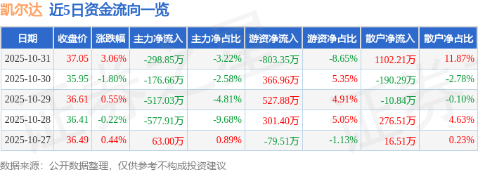 10月31日的资金流向数据方面,主力资金净流出298.85万元,占总成交额3.22%,游资资金净流出803.35万元,占总成交额8.65%,散户资金净流入1102.21万元,占总成交额11.87%。