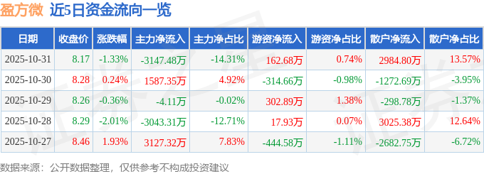 证券之星消息,截至2025年10月31日收盘,盈方微(000670)报收于8.17元,下跌1.33%,换手率3.3%,成交量26.94万手,成交额2.2亿元。