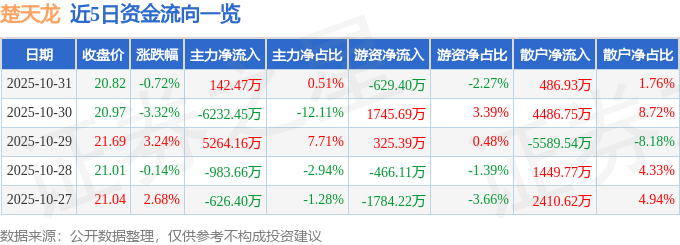 10月31日的资金流向数据方面,主力资金净流入142.47万元,占总成交额0.51%,游资资金净流出629.4万元,占总成交额2.27%,散户资金净流入486.93万元,占总成交额1.76%。