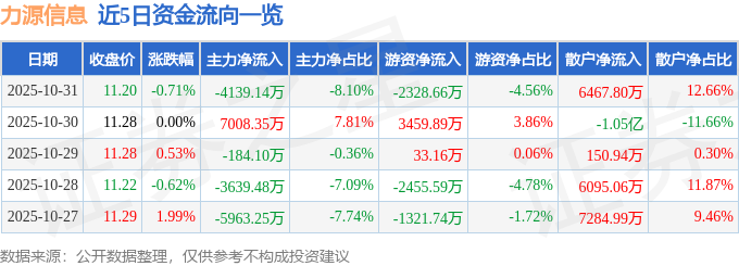 证券之星消息,截至2025年10月31日收盘,力源信息(300184)报收于11.2元,下跌0.71%,换手率4.35%,成交量45.59万手,成交额5.11亿元。