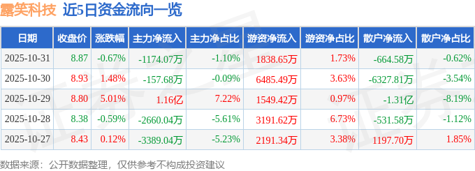 10月31日的资金流向数据方面,主力资金净流出1174.07万元,占总成交额1.1%,游资资金净流入1838.65万元,占总成交额1.73%,散户资金净流出664.58万元,占总成交额0.62%。