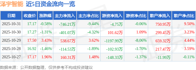 10月31日的资金流向数据方面,主力资金净流出746.21万元,占总成交额9.44%,游资资金净流出4.75万元,占总成交额0.06%,散户资金净流入750.95万元,占总成交额9.5%。