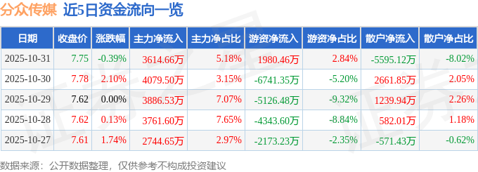 证券之星消息,截至2025年10月31日收盘,分众传媒(002027)报收于7.75元,下跌0.39%,换手率0.62%,成交量89.82万手,成交额6.98亿元。