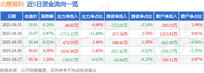 10月31日的资金流向数据方面,主力资金净流入48.02万元,占总成交额0.48%,游资资金净流出253.05万元,占总成交额2.54%,散户资金净流入205.03万元,占总成交额2.06%。