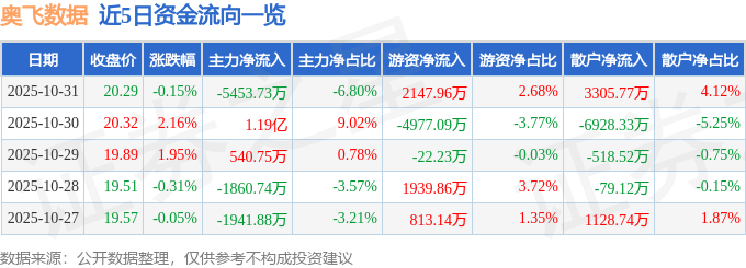 证券之星消息,截至2025年10月31日收盘,奥飞数据(300738)报收于20.29元,下跌0.15%,换手率4.0%,成交量39.43万手,成交额8.02亿元。