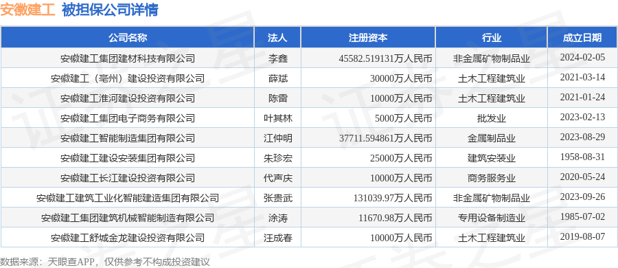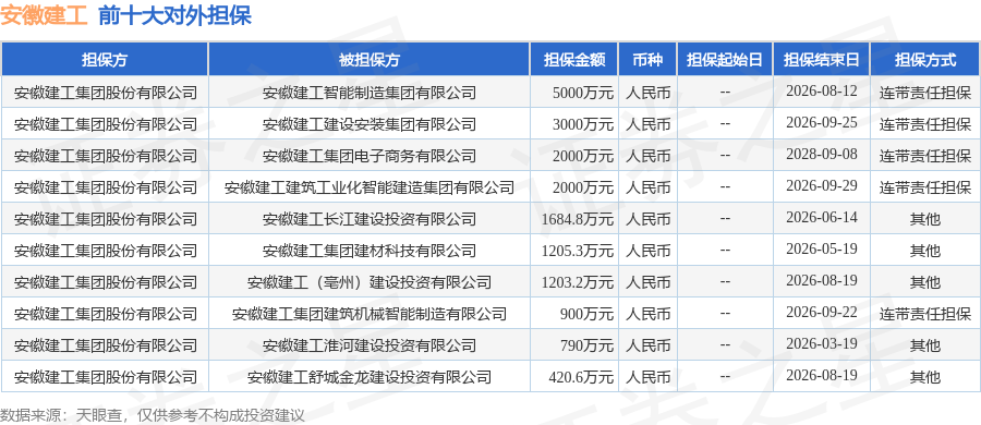 安徽建工10月30日披露12笔对外担保,被担保公司12家。担保金额排在前十的对外担保明细如下表: