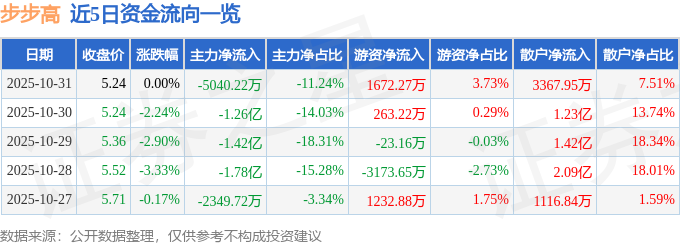 证券之星消息,截至2025年10月31日收盘,步步高(002251)报收于5.24元,上涨0.0%,换手率3.96%,成交量85.27万手,成交额4.49亿元。
