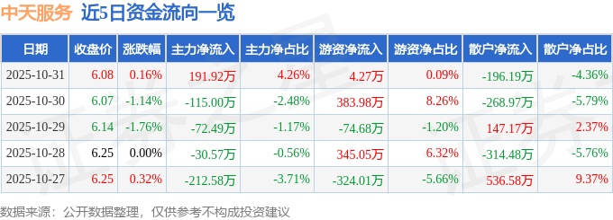 证券之星消息,截至2025年10月31日收盘,中天服务(002188)报收于6.08元,上涨0.16%,换手率2.87%,成交量7.38万手,成交额4503.21万元。