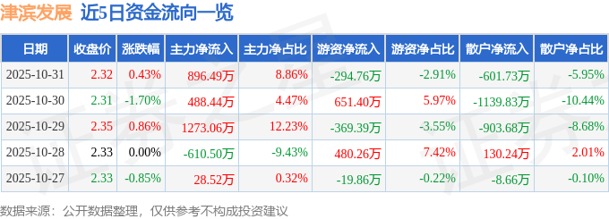 证券之星消息,截至2025年10月31日收盘,津滨发展(000897)报收于2.32元,上涨0.43%,换手率2.71%,成交量43.8万手,成交额1.01亿元。