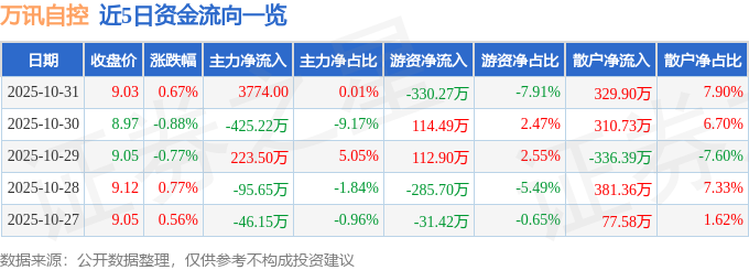 证券之星消息,截至2025年10月31日收盘,万讯自控(300112)报收于9.03元,上涨0.67%,换手率1.94%,成交量4.62万手,成交额4176.34万元。