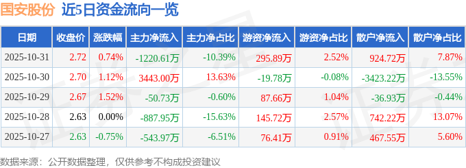 证券之星消息,截至2025年10月31日收盘,国安股份(000839)报收于2.72元,上涨0.74%,换手率1.11%,成交量43.41万手,成交额1.18亿元。