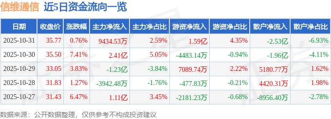 10月31日的资金流向数据方面,主力资金净流入9434.53万元,占总成交额2.59%,游资资金净流入1.59亿元,占总成交额4.35%,散户资金净流出2.53亿元,占总成交额6.93%。