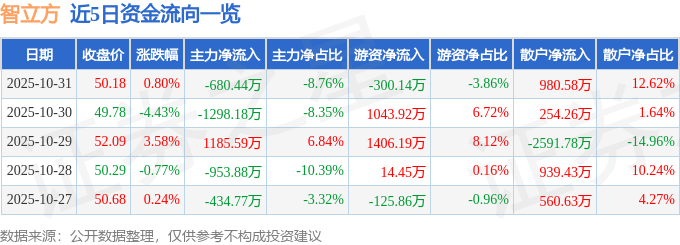 证券之星消息,截至2025年10月31日收盘,智立方(301312)报收于50.18元,上涨0.8%,换手率2.56%,成交量1.55万手,成交额7771.22万元。