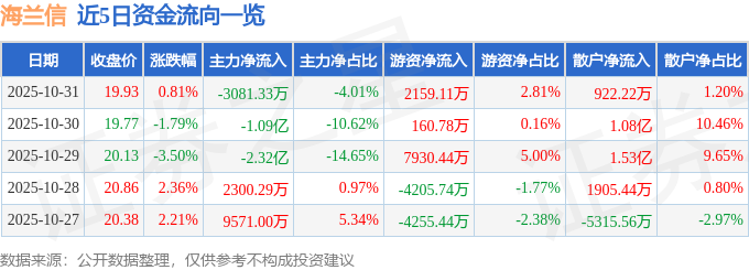 证券之星消息,截至2025年10月31日收盘,海兰信(300065)报收于19.93元,上涨0.81%,换手率5.89%,成交量38.65万手,成交额7.68亿元。