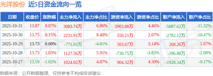 证券之星消息,截至2025年10月31日收盘,光洋股份(002708)报收于13.87元,上涨0.87%,换手率6.26%,成交量32.17万手,成交额4.5亿元。