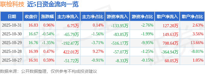 证券之星消息,截至2025年10月31日收盘,联检科技(301115)报收于16.83元,上涨0.96%,换手率2.36%,成交量2.88万手,成交额4845.41万元。