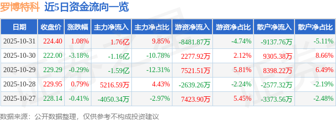 证券之星消息,截至2025年10月31日收盘,罗博特科(300757)报收于224.4元,上涨1.08%,换手率5.26%,成交量7.8万手,成交额17.88亿元。
