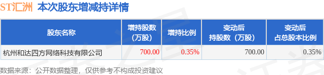 证券之星消息,10月31日ST汇洲发布公告《ST汇洲:关于股份增持计划进展暨实施完成的结果公告》,其股东杭州和达四方网络科技有限公司于2025年10月31日合计增持700.0万股,占公司目前总股本的0.3497%,变动期间该股股价下跌5.04%,截止10月31日收盘报3.58元。