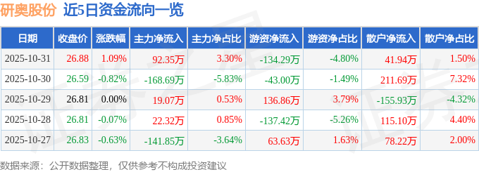 证券之星消息,截至2025年10月31日收盘,研奥股份(300923)报收于26.88元,上涨1.09%,换手率1.37%,成交量1.05万手,成交额2798.51万元。