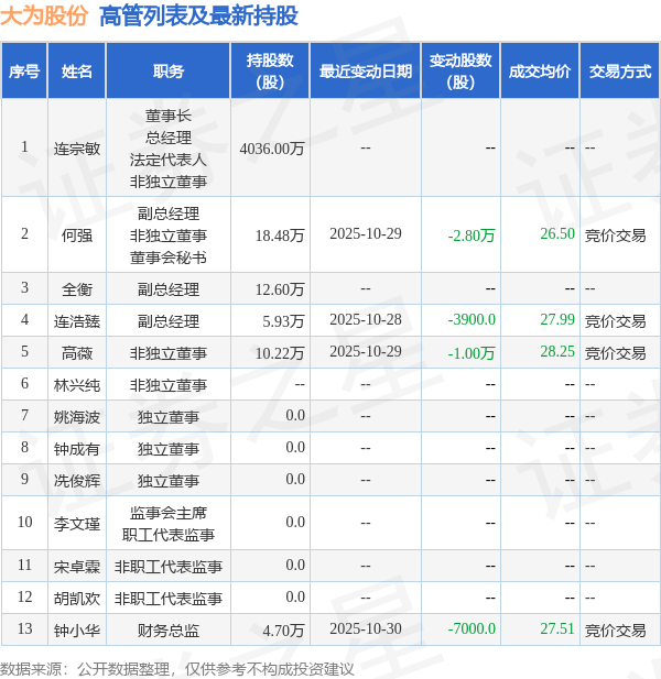 大为股份近半年内的董监高及核心技术人员增减持详情如下: