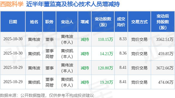西陇科学近半年内的董监高及核心技术人员增减持详情如下:
