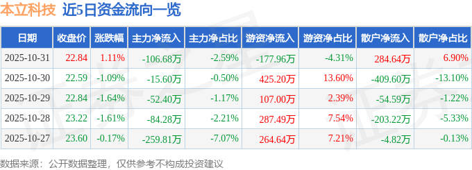 证券之星消息,截至2025年10月31日收盘,本立科技(301065)报收于22.84元,上涨1.11%,换手率2.09%,成交量1.8万手,成交额4125.5万元。