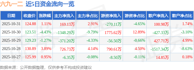 证券之星消息,截至2025年10月31日收盘,六九一二(301592)报收于124.88元,上涨1.11%,换手率2.0%,成交量4664.0手,成交额5812.31万元。