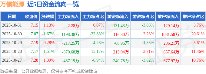 证券之星消息,截至2025年10月31日收盘,万憬能源(002700)报收于7.15元,上涨1.13%,换手率1.83%,成交量4.82万手,成交额3434.06万元。