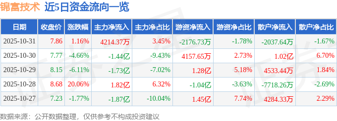 证券之星消息,截至2025年10月31日收盘,锦富技术(300128)报收于7.86元,上涨1.16%,换手率11.85%,成交量153.79万手,成交额12.23亿元。