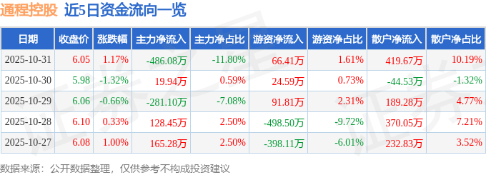证券之星消息,截至2025年10月31日收盘,通程控股(000419)报收于6.05元,上涨1.17%,换手率1.25%,成交量6.82万手,成交额4118.32万元。